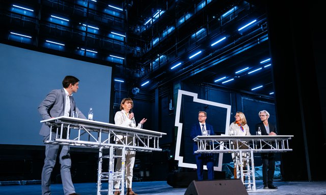Oberbürgermeisterin Henriette Reker, Stadtdirektorin Andrea Blome als Technische Betriebsleiterin der Bühnen, Stefan Charles, Beigeordneter für Kunst und Kultur, sowie Projektleiter Prof. Jürgen M. Volm haben auf einer Pressekonferenz im Schauspielhaus am Offenbachplatz den aktuellen Stand der Arbeiten auf der Bühnenbaustelle erläutert.